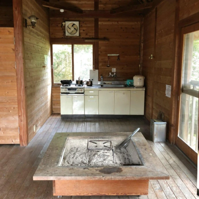 古代体験の郷まほろばの第三集落の中にある縦床式住居です。多目的住居を中心に四棟と竪穴式住居のある区画です。どの棟も囲炉裏があり、火を囲んでくつろげます。炊事場、風呂、トイレが備え付けられています。